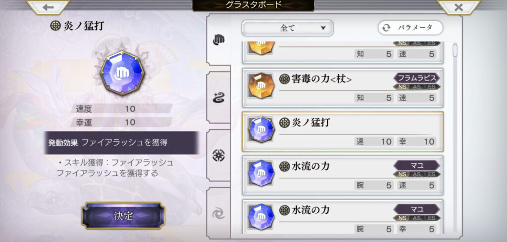 | グラスタ3 | 搦手ノ撃 (錬成有:潜在) | 与ダメUPさせるため。 錬成理由も同様。 |